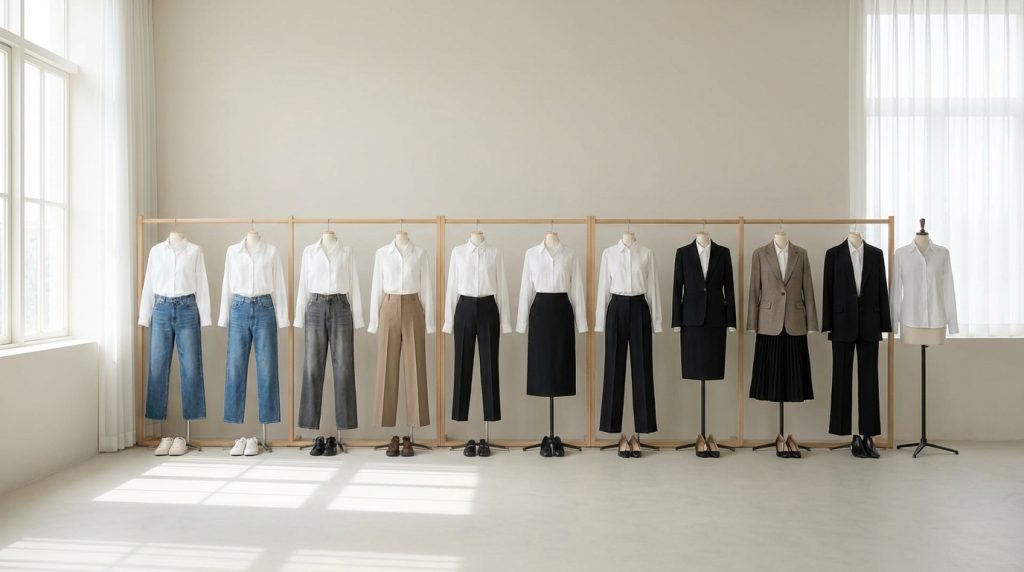 Per l’Ufficio Smart Casual: Fluidità e Raffinatezza. Se l’ambiente di lavoro è più smart casual, potete giocare con le texture e le sovrapposizioni, pur mantenendo un’aria curata. Una camicia bianca leggermente più morbida o con un taglio oversize può essere indossata con pantaloni culotte in lino o cotone, o con un pantalone chino sartoriale. Dei mocassini eleganti, delle ballerine in pelle di qualità o degli stivaletti bassi completano il look. Aggiungete un cardigan in cashmere o un gilet in maglia per un tocco di calore e raffinatezza. Evitate categoricamente capi troppo casual come t-shirt stampate sotto la camicia, jeans strappati o sneakers sportive.